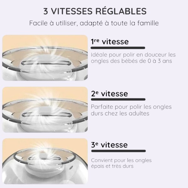 ⏰ Gain de temps & simplicité : oubliez l’arsenal (lime + coupe-ongles + polissoir). Un seul appareil, un seul geste, un résultat rapide.